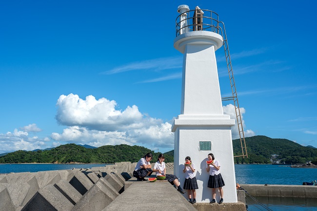 私は1年半ほど前から、「青春」をテーマとして多くの写真を撮影してきました。冬の早朝、夏の庭園などいろいろなシチュエーションで撮影してきました。今回このようなフォトコンテストで金賞をいただけたことは、これまでの努力が認められたように感じてとてもうれしく思います。私は、「青春」とは、何気ない日常の中で傍にいてくれる友達と、輝きや彩のある学生時代をともに過ごすことだと思います。このことを表現するために、地元の漁港で友達とすいかを切って食べているひと夏の思い出を表現しました。私自身もモデルになり、セルフィーで撮影しています。すいかに焦点を当てたのは、すいかの赤い切り口が笑っているように見えて、私たち自身に重なったように思えたからです。また、ロケーションを灯台にしたのにも理由があります。私たちが今ここで、この場所で大切な友達と青春時代を過ごしているという思いを灯台に重ねて表現したかったからです。4人で漁港まですいかを運んで切って食べるというストーリー。そして、私たちの青春を彩る地元の美しさに包まれたこの瞬間をずっと忘れないようにしようという思いを込めてシャッターを切りました。
