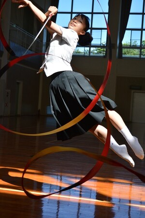 今回、私が撮った写真は、「リボンとジャンプ」というタイトルで、私の双子の姉がリボンを持ってジャンプしている写真です。なぜ、このような写真を撮ろうと思ったかというと、私は、小学校のころから12年間新体操をしてきていたこと、今回のフォトコンテストのテーマが「私たちの青春」だったことで、私の青春は「新体操」かなと思ったからです。そこで、制服を着て、リボンを持ってジャンプをしている写真を撮ろうと思いました。私は写真を撮るということで、学生時代を象徴する制服と私の青春である新体操がひとつの作品に凝縮され、それがずっとこれからも残っていくことに感激しています。これからも積極的に写真を撮り続け、上達できればと思います。私は高校3年生で今年で最後なのですが、とても良い思い出になりました。