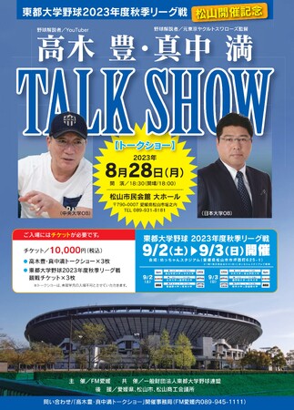 東都大学野球連盟が、2023年9月2日から3日間の日程で「令和5年度プレミアムユニバーシティズ22秋季リーグ開幕戦in松山」として愛媛県松山市の坊っちゃんスタジアムで秋季リーグ戦を行うことに合わせて、「東都大学野球2023年度 秋季リーグ戦 松山開催記念 高木豊・真中満トークショー」が開催されます。