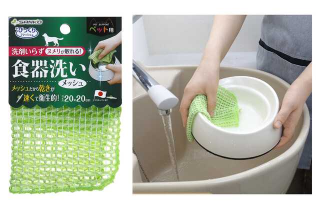今回のイチオシ商品「ペット用食器洗い メッシュ」は、特殊繊維で水だけでもヌメリを落とすことができます。メッシュ素材で水切れが良いのも嬉しいポイントです♪