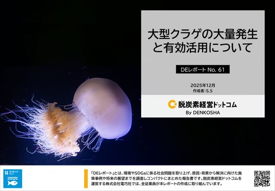 「RE100」の中小企業版「RE Action」に加盟し、脱炭素経営を推進する電巧社(本社:東京都港区、代表取締役社長:中嶋 乃武也)が運営する「脱炭素経営ドットコム」監修で、「大型クラゲ」」に関する実態調査を行い、レポートとしてまとめました。