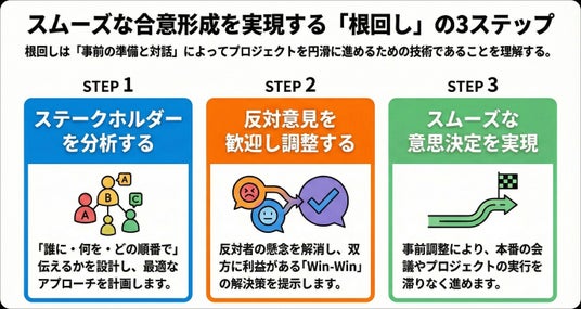 現代の組織において、プロジェクトを迅速かつ確実に進行させるためには、関係者の理解と協力が欠かせません。しかし、事前の調整が不足していると、会議での反対意見や予期せぬ衝突により、意思決定が停滞する場合があります。