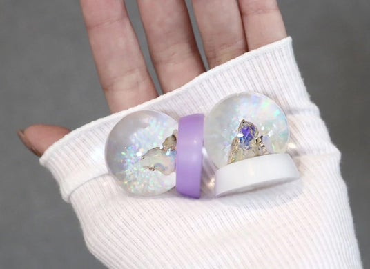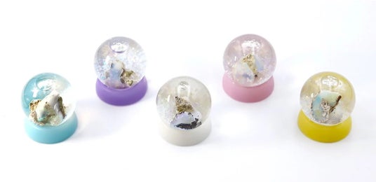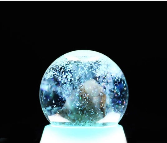 細かく砕いたオパールが、スノードームの中で舞う事で7色に煌きます。