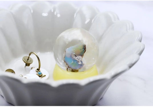 オパールの原石の周りを覆う幻想的な七色の雪。贅沢にオパールの粉を使った大人のスノードームです。