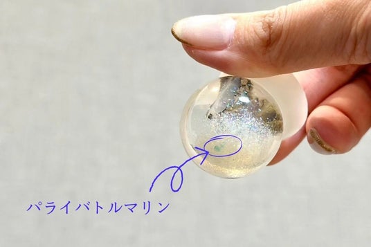 そんな希少性の高いパライバトルマリンが1粒入った、より価値が高いバージョンもご用意しました。スノードームを振ると、オパールの粉雪の中に、ネオンブルーのパライバトルマリンが現れます。