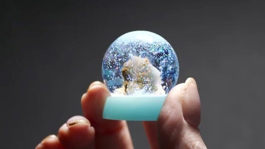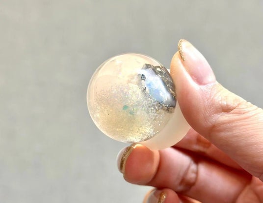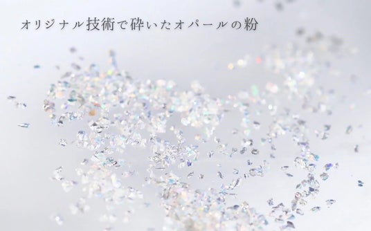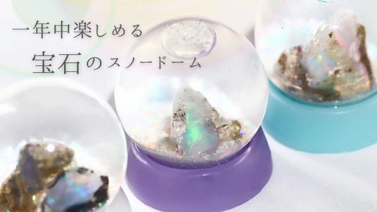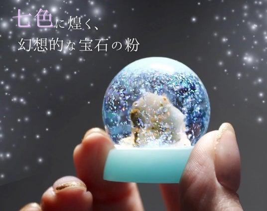 この宝石のスノードームに使われている“天然オパールの粉”は、職人の腕で細かく削って手作りで作りました。