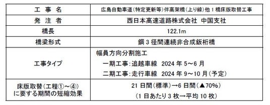 鹿島(社長:天野裕正)は、道路橋の床版取替工事に伴う交通規制を大幅に短縮できる「スマート床版更新(SDR※1)システム」(以下、SDRシステム)を、幅員方向分割(二車線道路の場合 一車線規制)で「広島自動車道(特定更新等)伴(とも)高架橋(上り線)他1橋床版取替工事」に導入しました。幅員方向分割取替を対象とするSDRシステムの実工事への導入は初めてです。この結果、既設床版の撤去から新設床版の架設までの一連作業に要する期間は、標準工法※2では21日間のところ、SDRシステムでは6日間となり、床版取替の期間を約70%短縮しました。