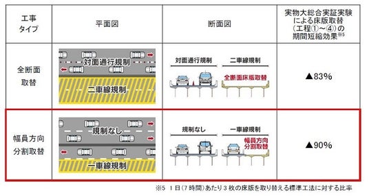 工事タイプの概要と実物大総合実証実験による床版取替の期間短縮効果