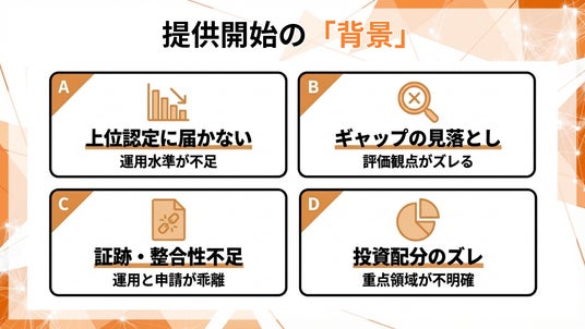 - 足りない領域に対して、必要な施策・サービス・運用を提案