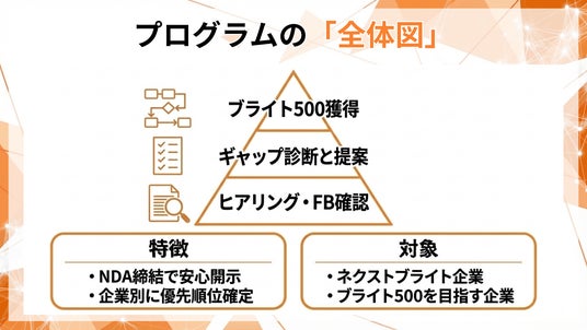本プログラムは、その前提に立ち、NDA締結の上でフィードバック情報を確認し、次年度のブライト500に向けた実行計画へ落とし込む支援を提供します。