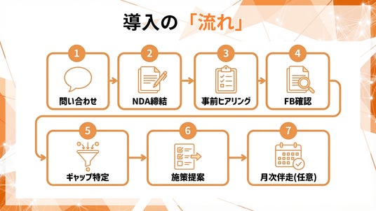 初回の情報交換では、NDA締結後にフィードバック確認の進め方、論点分解の観点、提案アウトプット(実行計画のたたき台)の範囲をご提示します。下記窓口までお問い合わせください。