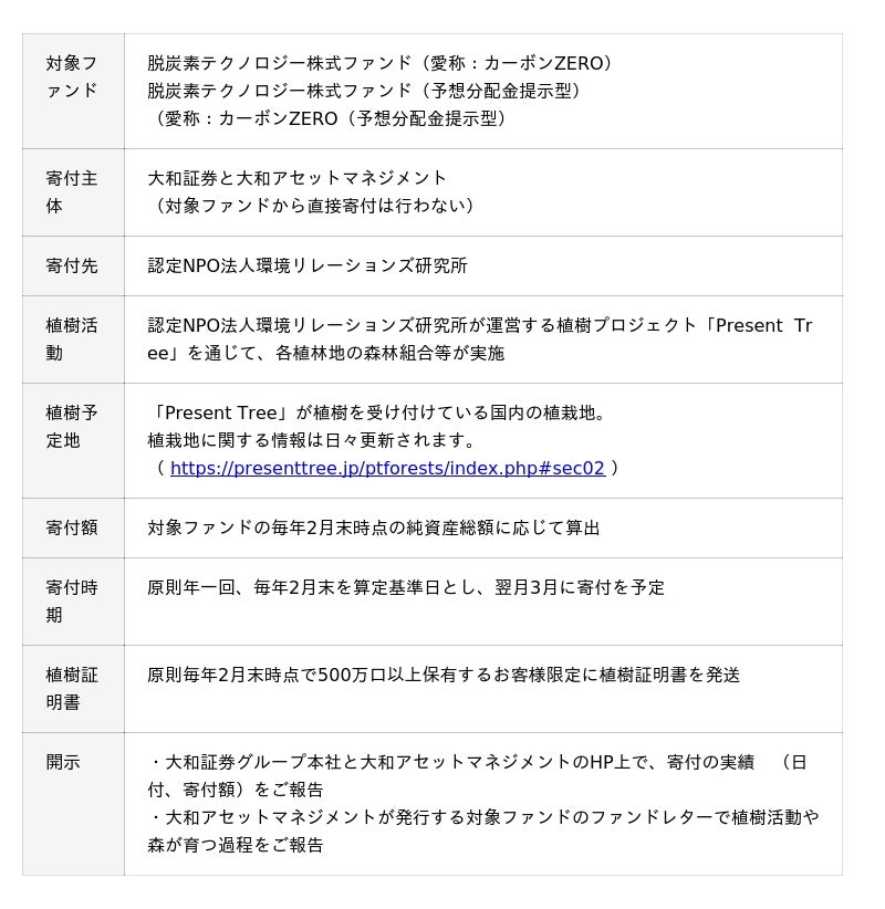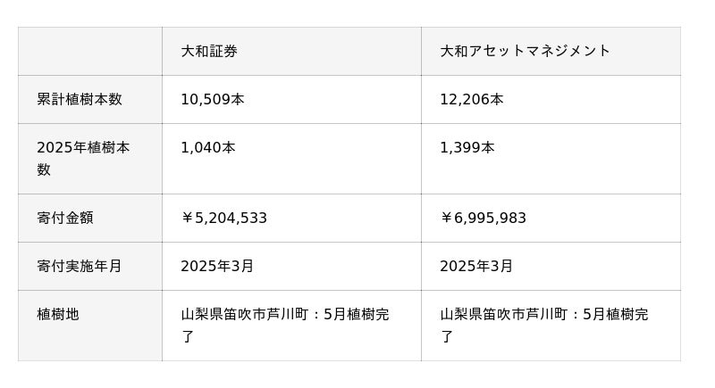 株式会社大和証券グループ本社傘下(以下「大和証券グループ本社」)の大和証券株式会社(本社:東京都千代田区、代表取締役社長:荻野 明彦、以下「大和証券」)と大和アセットマネジメント株式会社 (本社:東京都千代田区、代表取締役社長:佐野 径、以下「大和アセットマネジメント」) は、「脱炭素テクノロジー株式ファンド(愛称:カーボンZERO)」および「脱炭素テクノロジー株式ファンド(予想分配金提示型)(愛称:カーボンZERO(予想分配金提示型))」(以下総称して「本ファンド」)の信託報酬の一部を、認定 NPO 法人環境リレーションズ研究所の植樹活動に寄付いたしました。2025年は山梨県笛吹市芦川町に2,439本、プロジェクト開始以来、累計22,715本の植樹を支援することができましたのでお知らせいたします。