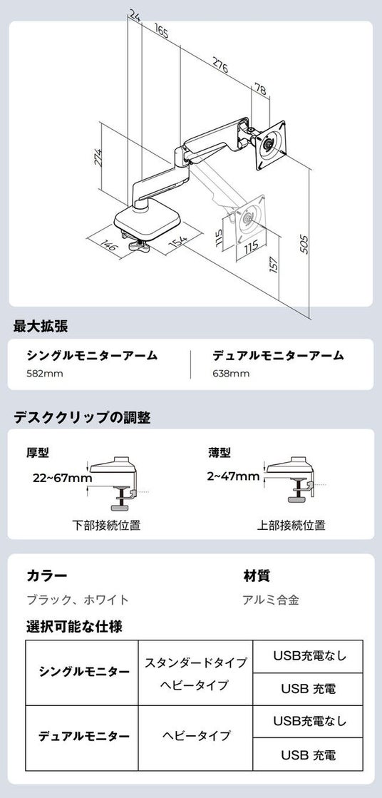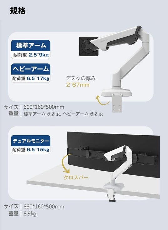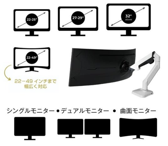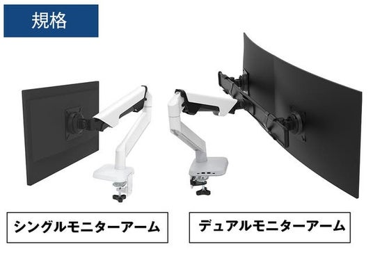 3. シングル・デュアルモニターで使用可能、最大17kg・49インチまで対応のパワーモニターアーム