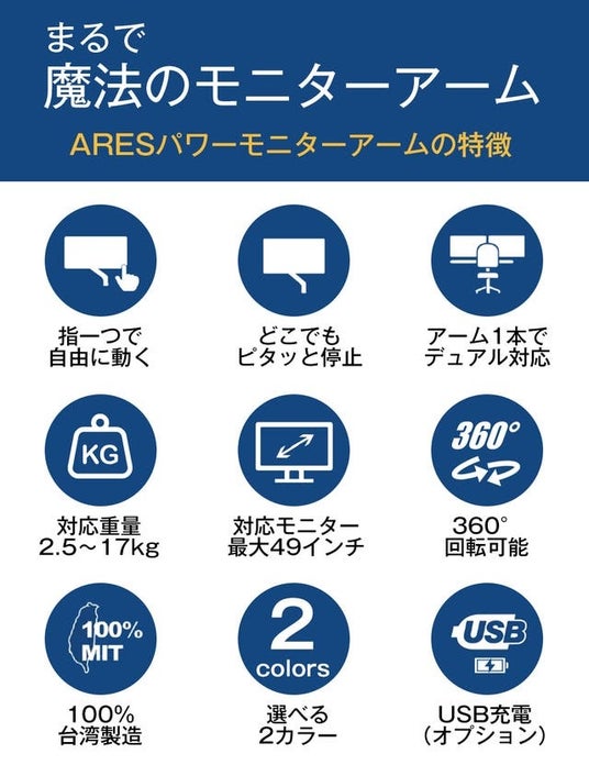 10月4日Makuakeにて公開した『ワンタッチでモニターを自在に操る!デザイン賞受賞作|ARESパワーモニターアーム』が、即日目標達成。Makuakeデイリーランキング、総合やガジェット部門で入賞するという人気アイテムです。