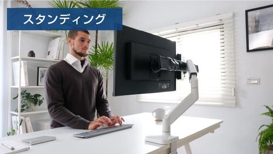 スタンディングデスクとして使用する際も、立ち姿勢や目線にぴったり合わせた最適な位置で、快適に作業を続けられます。姿勢を変えてもスムーズにディスプレイを調整できるため、長時間の作業でも疲れにくく、効率を最大限に引き出せます。