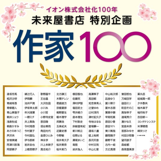 株式会社未来屋書店(本社:千葉市美浜区、代表取締役社長:平川雅隆、以下、 未来屋書店)は、イオンの株式会社化100年を記念し、2026年3月6日(金)から4月25日(土)までの期間、特別企画『作家100』フェアを全国の未来屋書店200店舗で開催します。