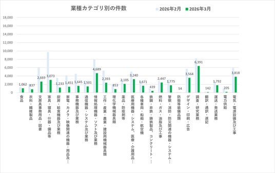 2026年3月の業種別入札件数では、多くのカテゴリで前月から減少が見られました。