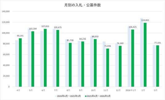 2026年3月の入札・公募件数は77,101件でした。前月(2026年2月:119,002件)から41,901件の減少(前月比64.8%)となり、大きく件数が減少しました。
