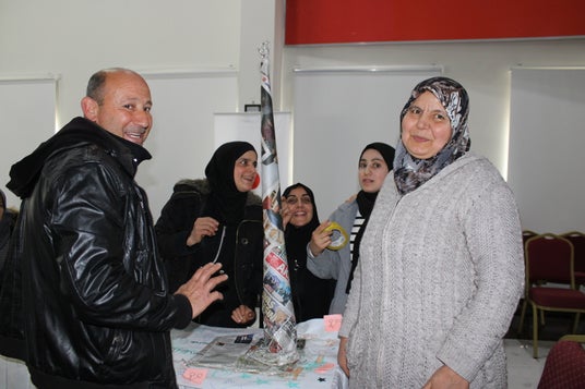 新聞紙を使った言葉の壁に関する演習に取り組むライフスキル研修の参加者