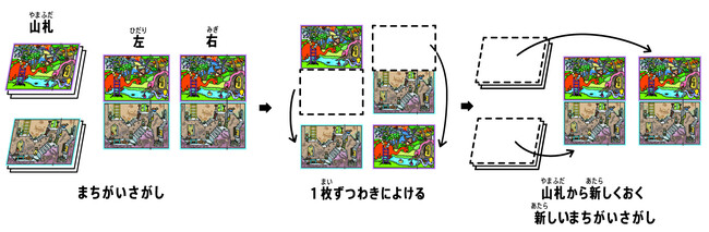 シーンを2種類選んだら、山札から2枚ずつ取って並べます。左右のカードを見くらべて、順番に1人1個ずつまちがいを指摘していきます。制限時間内にまちがいが見つからなければ時間切れとなり、全員時間切れになるとこの回は終わり。まちがいを多く見つけた人に得点が入ります。山札から1シーン1枚ずつカードをかえて、新しく次の回のまちがいさがしを始めます。これを数回くり返して、得点が一番多い人の勝ちです。
