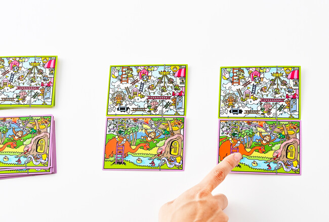 通常のまちがいさがしは「○個見つけたら終わり」ですが、本商品は「まちがいがもう見つからない」と思ったらカードをかえます。すると、別のまちがいが生まれたり、さっきはまちがいだった場所がまちがいではなくなったりして、次々に新しいまちがいさがしにかわっていきます。