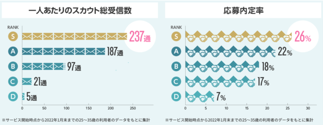 スキルランクが高い人材ほど転職で有利になることは、データからも示されています。企業からのスカウトメール受信数や応募後の内定率は、ともに高ランクほど大きくなっています。