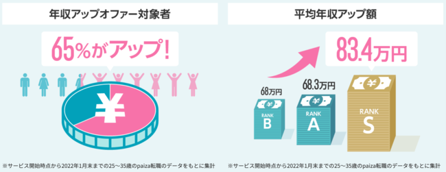さらに、 転職時に提示される年収も、 スキルが高い人ほどアップ幅が大きいという結果が出ています。 特にSランクでは、平均で1人あたり83.4万円のアップとなっています。このように「paizaスキルチェック」によるランク測定結果は、スキル証明の指標として多くの企業が評価・利用しています。