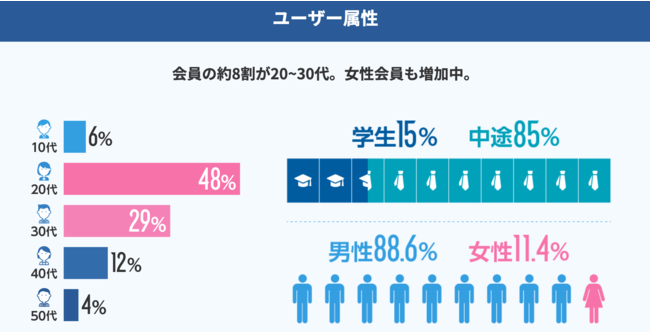 ユーザーは20~30代が中心で全体の約8割を占めています。さらに、徐々に女性の割合も増えており、現在は1割超となっています。