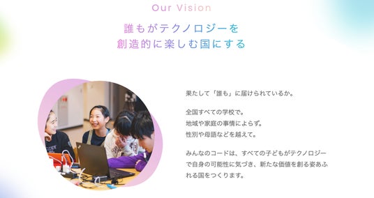 私たちは、性別、地域や家庭の経済環境、教育機会の有無、母語などに関わらず、さまざまな背景を持つすべての子どもにテクノロジー教育の機会をつくることを目指しています。リニューアルしたコーポレートサイトでは、子どもたちがデジタルの世界で単なる消費者に留まらず、自らが創造者となり、自己表現や課題解決、そして新たな価値をデジタルで生み出すことを支援する言葉を綴りました。