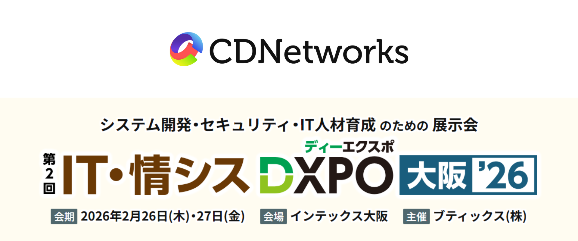 APACを中心に世界をリードするグローバルCDNベンダである株式会社シーディーネットワークス・ジャパン(本社所在地: 東京都千代田区、代表取締役: 李安明、以下「CDNetworks」)は、2026年2月26日(木)、27日(金)に開催されるイベント「IT・情シスDXPO大阪’26」の「ITインフラ・セキュリティ展」に協賛し、クラウド型Webセキュリティ統合プラットフォーム「Cloud Security 2.0」を展示します。