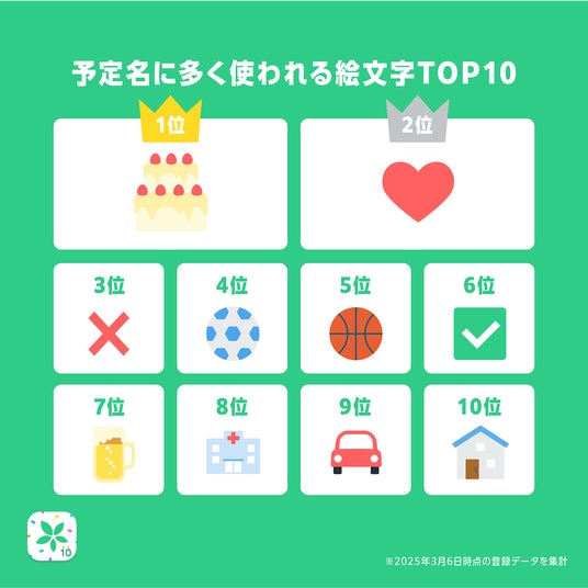 例えば、予定名に多く使われる絵文字のTOP10を集計すると、1位の「誕生日ケーキ」の絵文字や2位の「ハートの絵文字」など、予定を共有している相手へのお祝いの気持ちや愛情を感じ取れるものが上位を占めています。