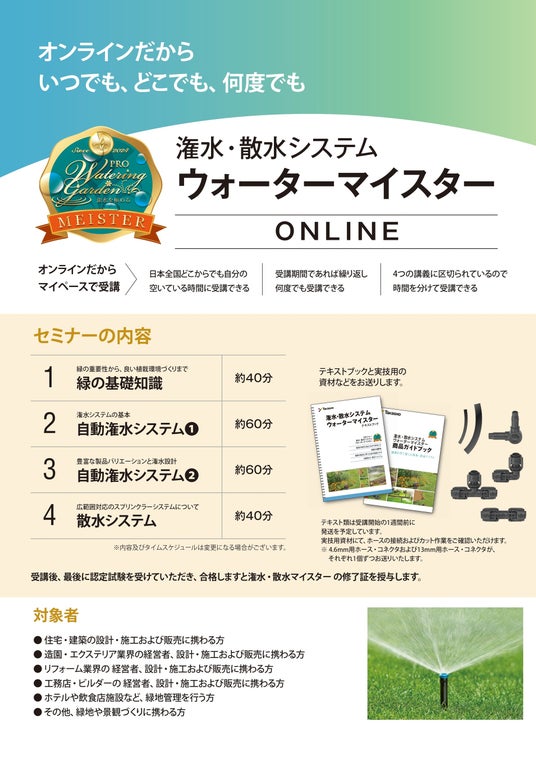 本研修会の開催を重ねる中で、開催場所や日程の都合で参加が難しい方々から、オンライン受講に関する要望を多数いただいておりました。そこで当社では、庭照明のプロを養成する「ガーデン&エクステリア ライティングマイスター」で培ったe-ラーニングのノウハウを活かし、本マイスターにおいてもe-ラーニングプログラムの提供開始に至りました。これにより、時間や場所にとらわれることなく、より多くの方々が手軽に受講できる環境を整え、潅水・散水のプロフェッショナル人材の養成を加速してまいります。