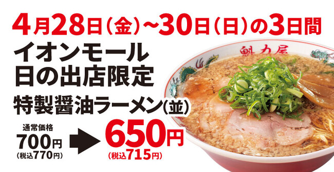 この度オープンを記念して、「イオンモール日の出店」にご来店いただいたお客様には、『特製醤油ラーメン(並)』を650円(税込715円)で販売いたします。