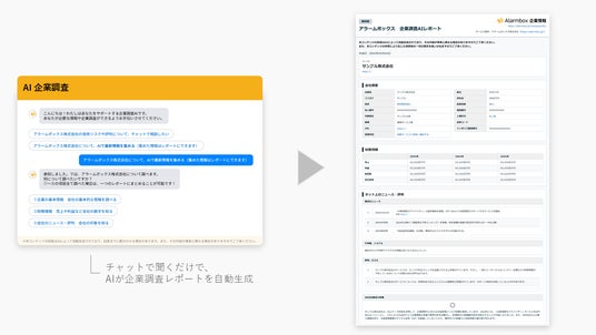 AI与信管理サービスを提供するアラームボックス株式会社(本社:東京都新宿区、代表取締役:武田浩和、以下「当社」)は、「アラームボックス企業情報」において、生成AIとチャット機能を活用し、企業信用調査からレポート作成までを一気通貫で行える新機能「企業調査AIレポート」の提供を開始いたします。