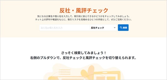 本機能では、取引前に確認しておきたい反社リスクや風評、インターネット上の評判・口コミ・ニュースについて、目的に応じた調査をサイト内で完結して行うことが可能です。