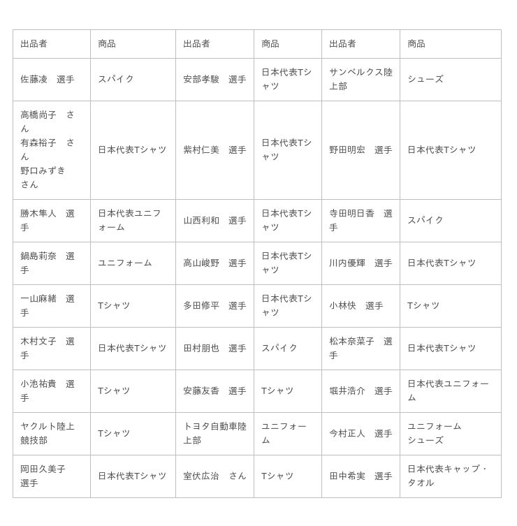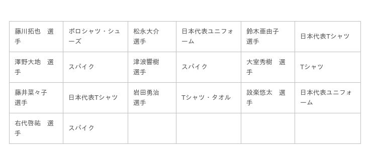 第2弾では、日本代表選手をはじめとした現役アスリートから、室伏広治さん・有森裕子さん・高橋尚子さん・野口みずきさんら陸上界を代表する歴代メダリストが、集大成となる競技会に向けてひたむきに練習を積み重ねている中高生のため、大変貴重な商品を出品しました。