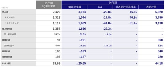 売上高はスキルシェアが好調で順調に拡大。人材紹介も6四半期ぶりに前年同期比プラス成長に転じました。戦略投資(広告宣伝投資と人的投資)が上期に集中したため営業利益の進捗率は低位ですが、期初計画に沿って推移しています。