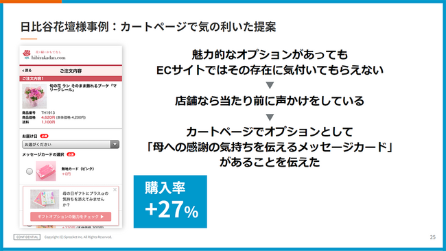 1つは、商品選びをサポートするシナリオです。簡単な質問をしながら顧客に寄り添って適切な商品を提案することで、購入率は108%に向上しました。また、お花にメッセージカードを添えるオプションがあっても、ECサイトでは存在に気付かないことがあります。別のシナリオでは、カートページで「母の日ギフトにプラスαの気持ちを添えてみませんか?」と声かけすることで店員のような気の利いた接客を再現し、購入率が127%に改善しました。