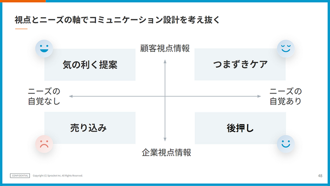 ニーズの自覚がないところに企業視点の情報を投げかけるのは、一方的な「売り込み」です。Webサイトではクーポンや新商品などの「売り込み」をしてしまいがちですが、顧客の心理や状態に合わせて、ECサイト内でのつまずきをケアしたり、気の利く提案をしたり、後押ししたりといったコミュニケーションを設計する必要があります。
