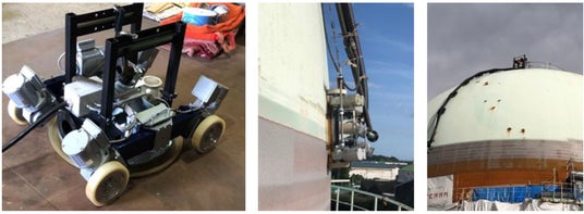 左:ブラストマシン 中・右:マシンがガスホルダーの外周を自動で水平に周回、均一かつ効率的な施工を実現