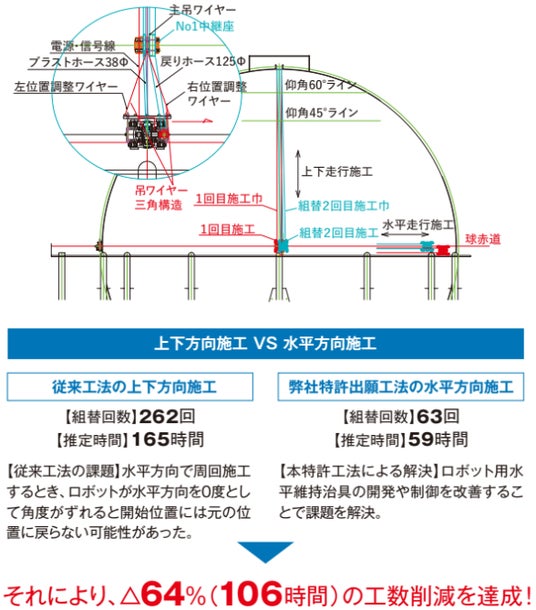 出願した工法は、ガスホルダーの頂部からマシンをワイヤーで吊り水平方向に施工するもので、施工範囲の重なりが最小限に抑えられ、組替回数と施工時間も大幅に削減します(左図)。また、マシンに位置制御プログラムを組み込むことで、施工面へ研掃材が当たる箇所を高精度に制御できるようになりました。その結果、均質な施工を実現するとともに、ダストの発生を最小限に抑えられるため、産廃処理費も削減できます。