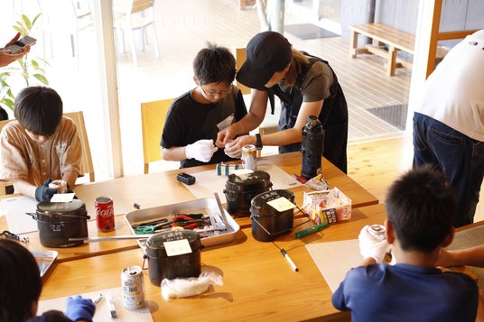 ワークショップに参加したのは、和歌山県西牟婁地方に在住の小学生9名。各々は自宅にあった廃棄アルミ缶を持参し、ガスコンロ作りに奮闘。完成後は、実際に自分たちで作ったガスコンロを使って飯盒でご飯を炊き、カレーを温めて食べました。