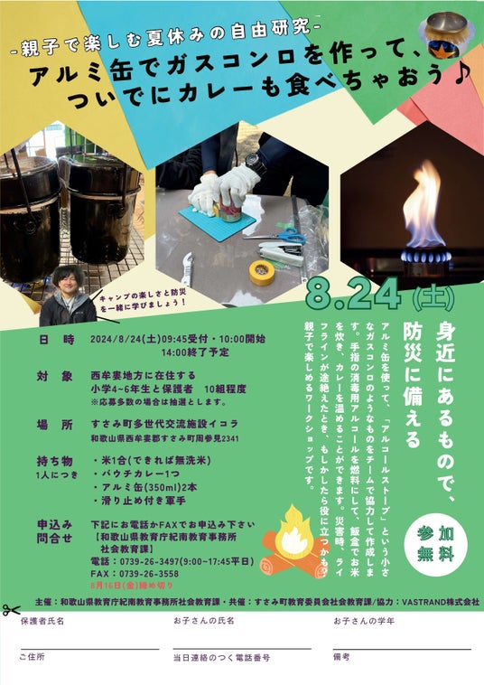 キャンプギアブランド「VASTLAND(ヴァストランド)」を展開するVASTLAND株式会社(本社:兵庫県姫路市/代表:田中悠貴)は、和歌山県教育庁紀南教育事務所社会教育課が主催する絆づくり事業に協力し、身近なもので防災に備える体験型ワークショップ「アルミ缶でガスコンロを作って、ついでにカレーも食べちゃおう。」を8月24日(土)に開催しました。