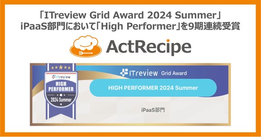 iPaaS「ActRecipe」を提供するアクトレシピ株式会社(本社:東京都港区、代表取締役CEO:池上大介、以下「アクトレシピ」)は、アイティクラウド株式会社主催「ITreview Grid Award 2024 Summer」におきまして、ActRecipeがiPaaS部門にて「High Performer」を9期連続受賞したことを発表します。