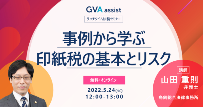 リーガルテックサービス「GVA」シリーズを提供するGVA TECH株式会社(本社:東京都渋谷区、代表取締役:山本 俊、以下GVA TECH)は、2022年5月24日(火)12時から、鳥飼総合法律事務所(所在地:東京都千代田区)の山田 重則 弁護士に登壇いただき、「印紙税の基本とリスク」について解説いただくセミナーを開催することをお知らせいたします。