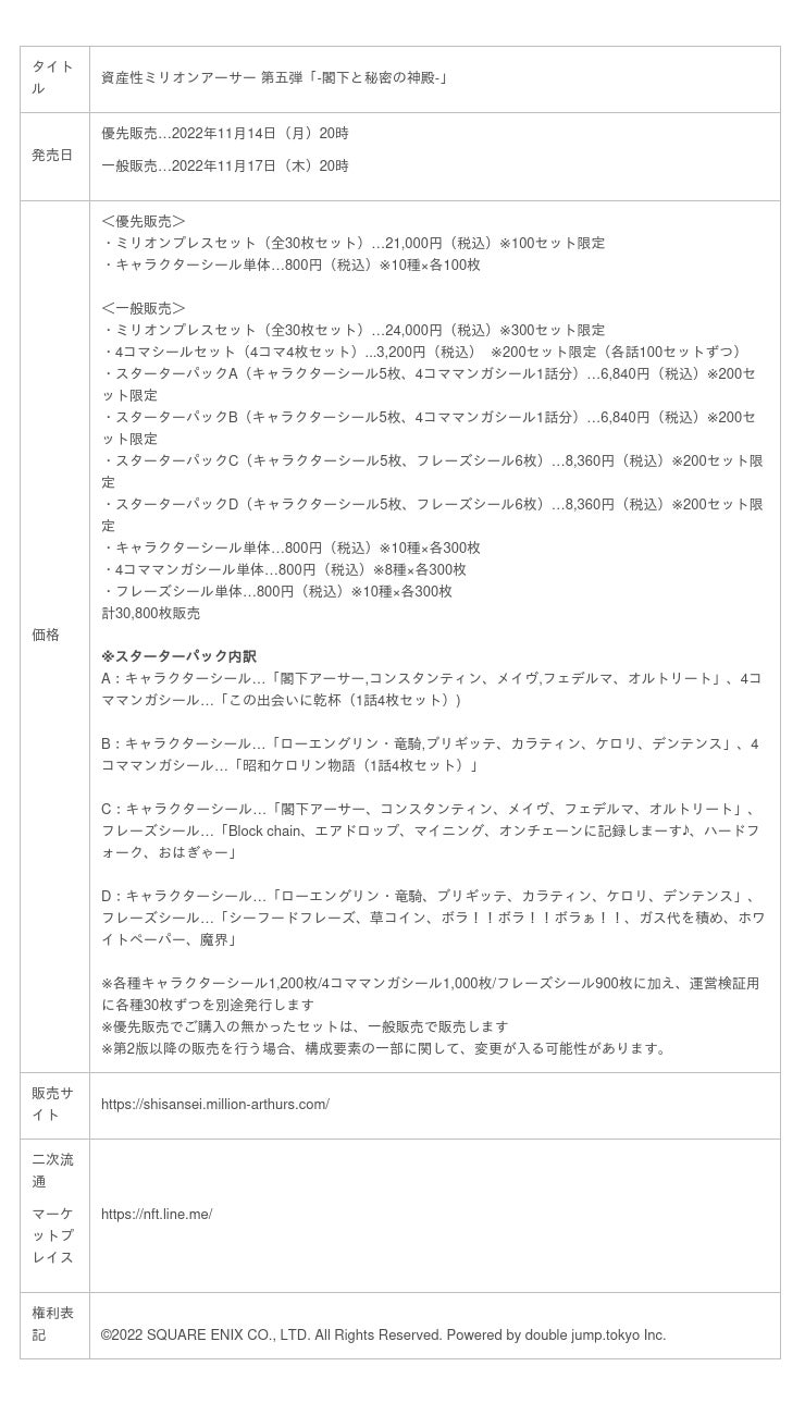 ブロックチェーン技術を用いたアプリケーション開発を行うdouble jump.tokyo株式会社(本社:東京都新宿区、代表取締役:上野広伸、以下「double jump.tokyo」)は、株式会社スクウェア・エニックス(本社:東京都新宿区、代表取締役社長:松田洋祐)との共同開発によるNFTデジタルシール『資産性ミリオンアーサー』おいて、第五弾「-閣下と秘密の神殿-」を発売します。