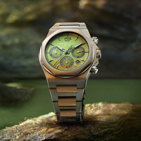 時針と分針は部分的な透かし彫りで、ファセット加工のバトン型の植字インデックスとコーディネートされています。針先とインデックスはいずれもホワイトの蓄光塗料付きで、暗がりではグリーンに発光します。スネイル仕上げの 3つのカウンター、30分積算計、12時間積算計、スモールセコンドがダイヤルをさらに引き立てます。センターのクロノグラフ秒針は先端がブラックで、ダイヤルを縁取るフランジのミニッツトラックまで伸びています。これらの機能を締めくくるのは、4時位置と5時位置の間にある日付表示です。そして、ダイヤルの頂点付近にはGPの名がホワイトの文字で、そのすぐそばにはブランドのロゴが浮き彫りで配されています。