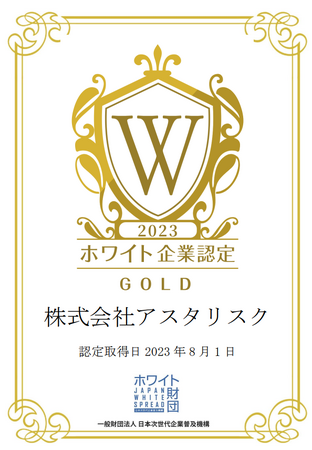 株式会社アスタリスク様が、一般財団法人日本次世代企業普及機構(通称:ホワイト財団)が運営する「ホワイト企業認定 ゴールドランク」を取得しましたことをお知らせいたします。