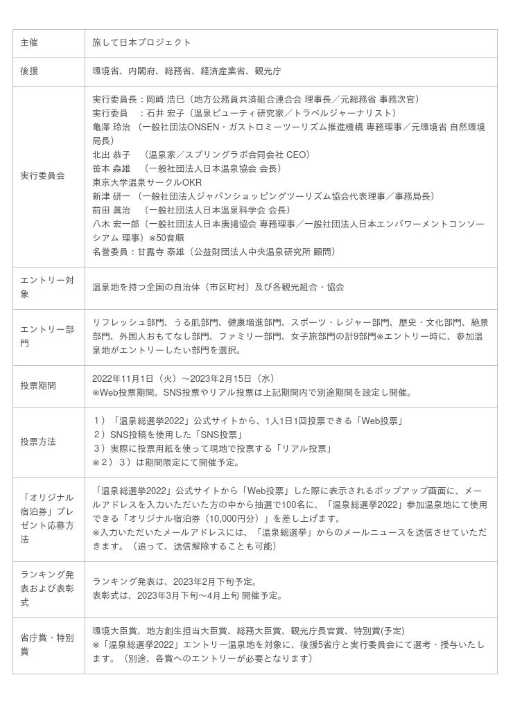 最新の情報は「温泉総選挙2022」サイトhttps://kanko.onsen-ouen.jp/ の「新着情報」をご参照ください。