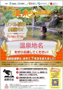 「リアル投票」は2019年度にも実施しておりましたが、感染症対策の兼ね合いもあり、2年ぶりの実施となります。公式サイトを経由した「Web投票」に加えて実施することにより、「温泉総選挙2022」の更なる盛り上がりを目指してまいります。全国旅行支援を使って、温泉地を訪れる方も多いかと思いますので、「リアル投票」実施温泉地を訪れた際には、ぜひ!あなたの清き一票を投票してください。